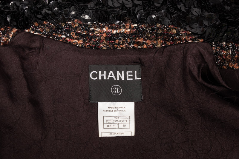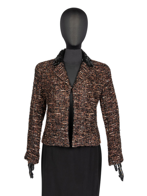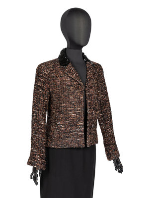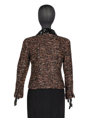 Brown, black, and white mohair/nylon-blend fancy weave jacket trimmed with a top collar of black fancy sequins. The jacket is cut with long sleeves that feature a special detail of an invisible zipper sewn down the length of the interior seam, which opens completely to the inside. The hem of the sleeve features black fancy buttons. The jacket has a notched label, two pockets on the front, and a center front single snap closure. The jacket is lined with brown silk woven with the CC logo and camellias. The jacket is finished with a gold-tone chain on the interior hem.