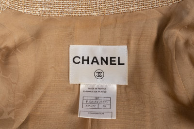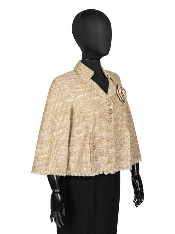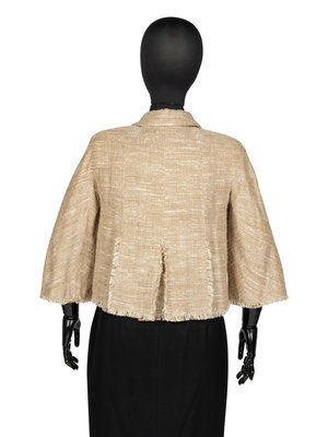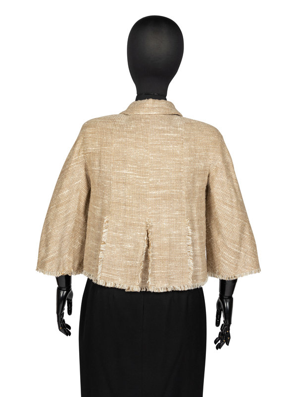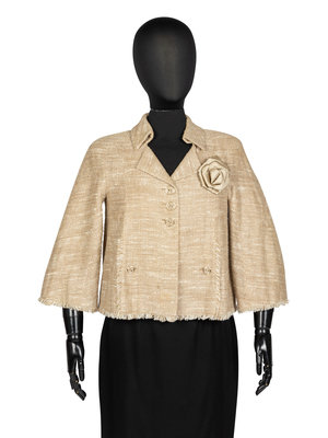 Linen-blend tan and white fancy weave jacket with a flared hem and finished with a self-fabric fringe. The jacket is cut with a notched lapel, sleeves cut in one with the front and back panels, pockets over each hip, and a center front three-button closure. The jacket comes with a detachable silk satin flower pin.