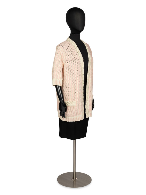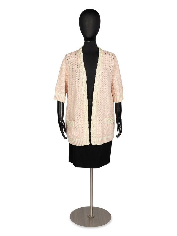 Pink and white fancy knit cotton-blend long cardigan with a deep v neckline, 3/4-length sleeves, two front pockets (unopened), and no closures down the center front. There is a small CC logo piece in pink and white that is sewn to the left front hip.