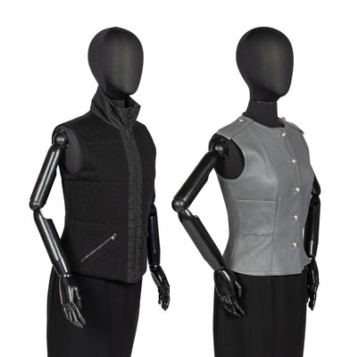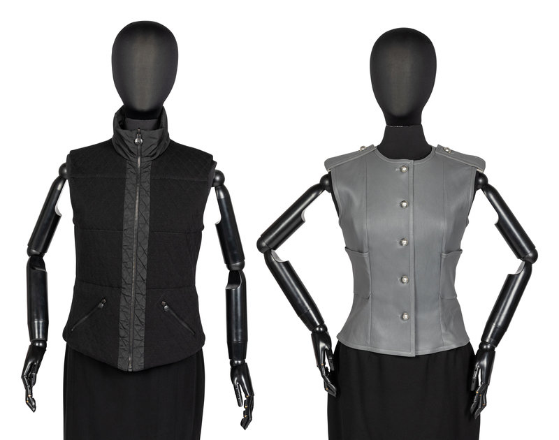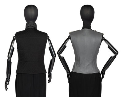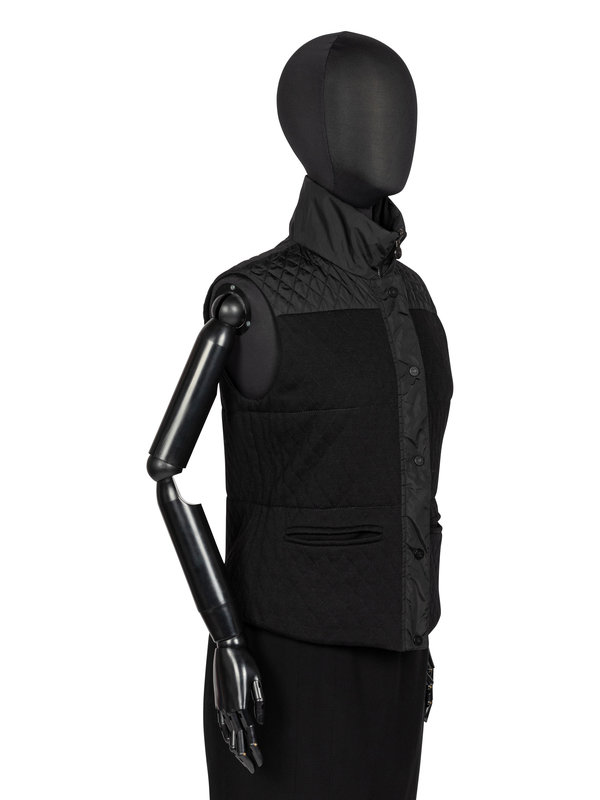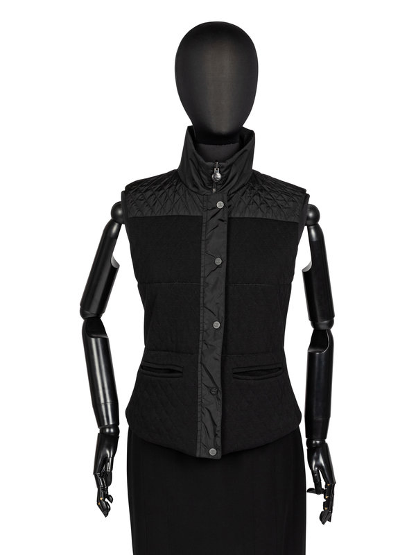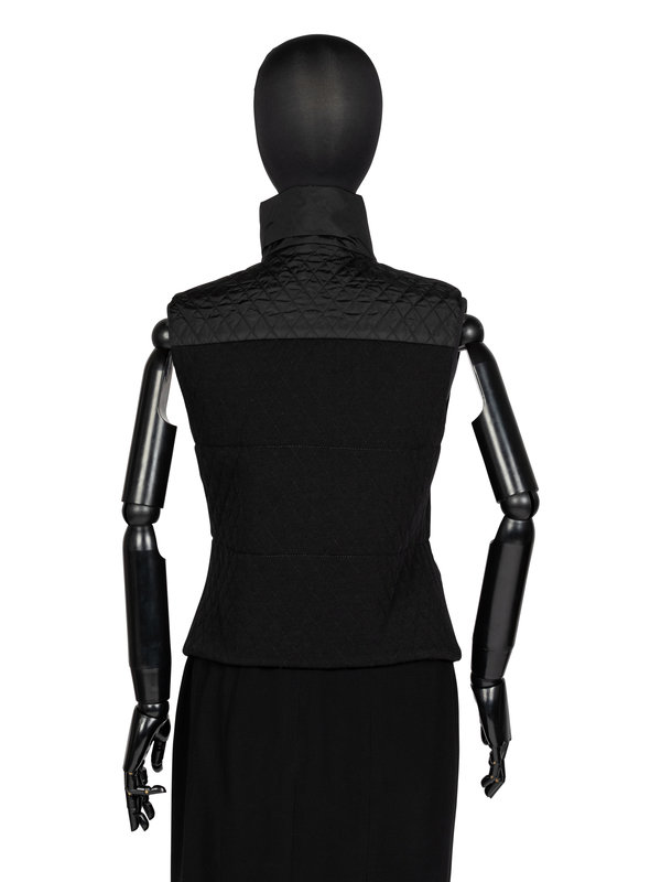 Sleeveless and reversible black quilted wool vest trimmed with black nylon. The vest has a stand collar and closes down the center front with a zipper and snaps. The design is different on each side.