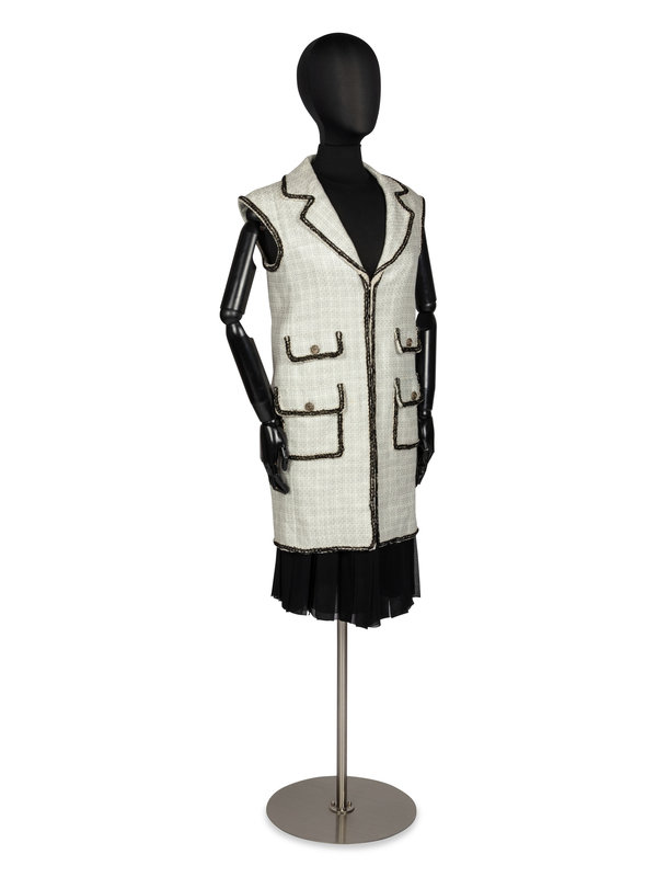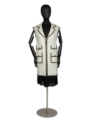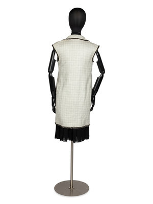 Sleeveless long white and black linen/cotton/silk tweed vest with a notched lapel and front pockets. The vest is lined with white silk woven with a CC pattern along with the name "CHANEL" in cursive. The center front closure is with bronze and gold-tone CC logo buttons. The overall design is outlined with black braid.