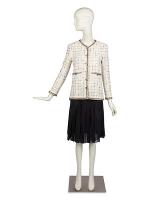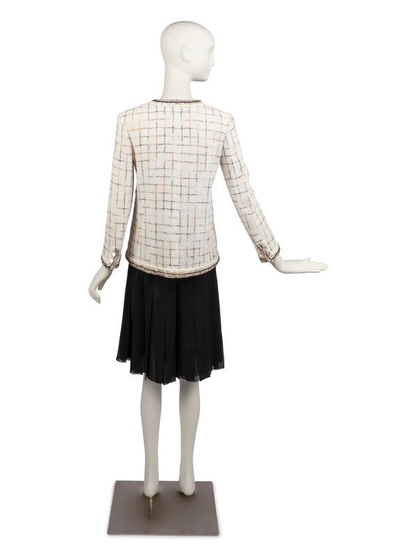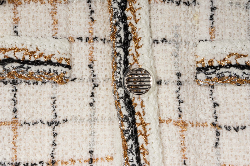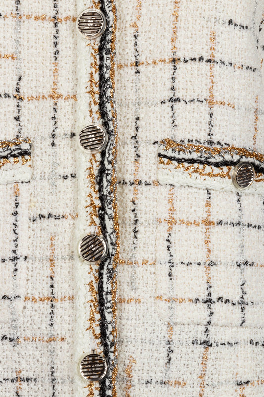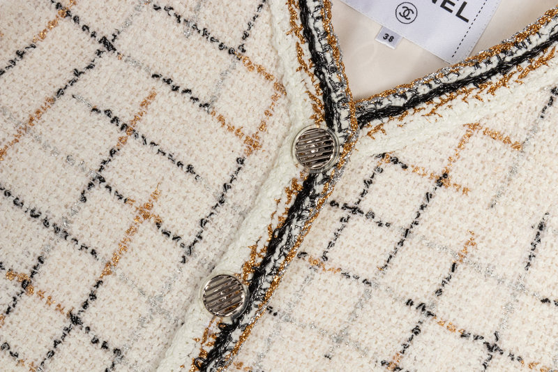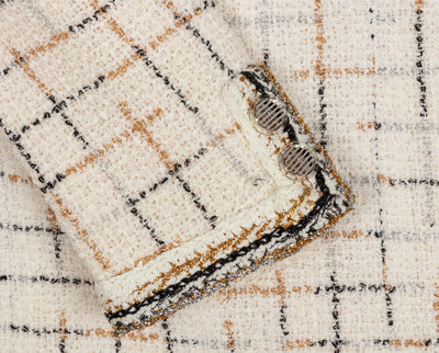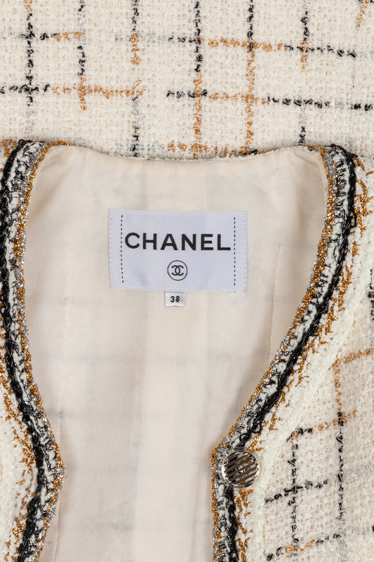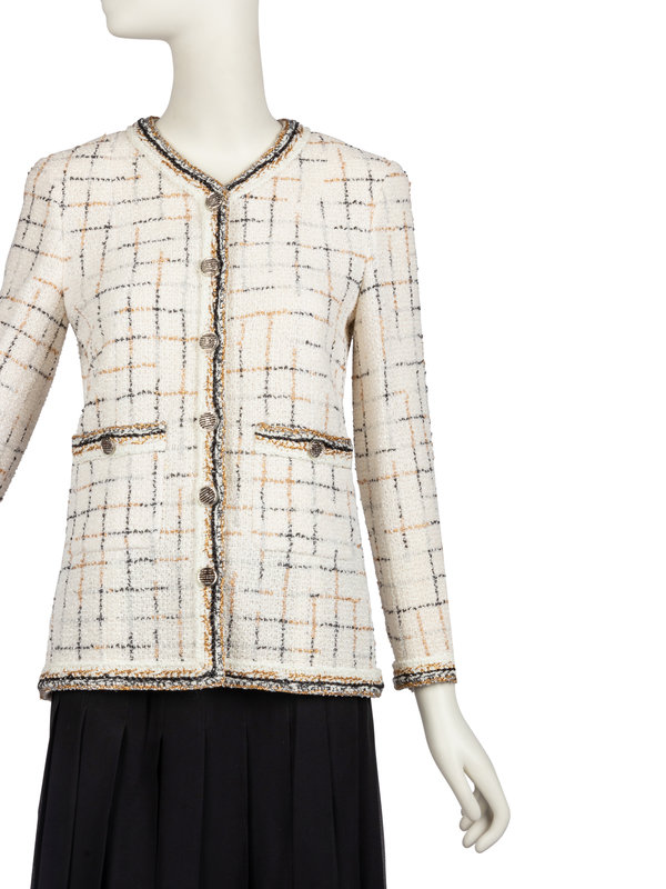 White wool/silk and other fiber-blend boucle woven with a plaid pattern in gold, black, and silver yarns. The jacket is trimmed with a gold, silver, and black yarn design around the neck, sleeve hems, and pockets. The jacket is cut with a v-neckline, long sleeves, two pockets on the front, and closes down the center front with buttons. The buttons are made with open lines, through which the CC logo can be seen. The jacket is lined with white silk woven with CC logos, camellias, and the words "Chanel rue Cambon". The jacket is finished with a silver-tone chain sewn to the interior hem.