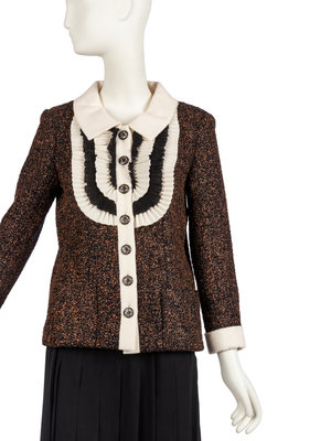 Cardigan jacket made of a black and orange plasticized material trimmed with a cream wool. The jacket is cut with a fold down collar, long sleeves with a cuff and button hem, two front pockets, and a tiered "bib" at the center front. The fancy buttons are in the shape of camellias with see-through sections. The jacket is lined with silk woven with the CC logos and flowers. The jacket comes with the Chanel retail label listing the price at $8900.00. The jacket appears unworn.