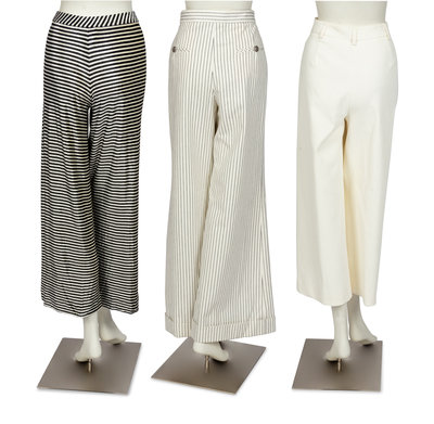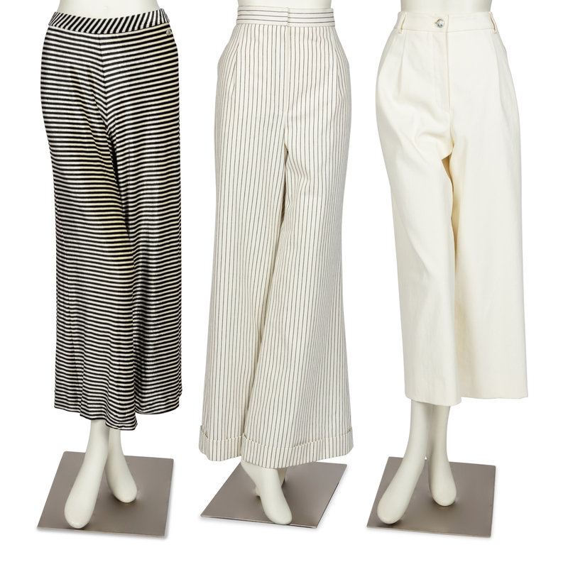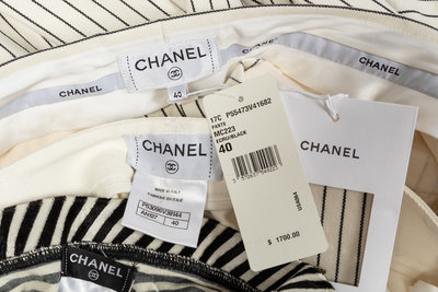 White 100% cotton pants with pleated waistband and faux pockets at the hip, button and zipper closure at the front,\ with a button that appears to be painted, and a double "CC" logo at the side.