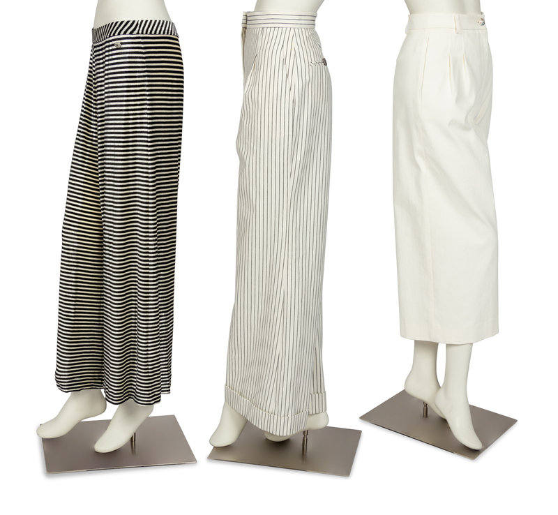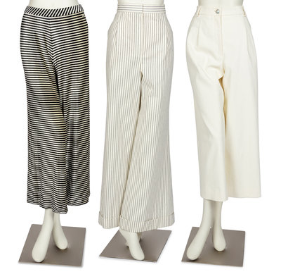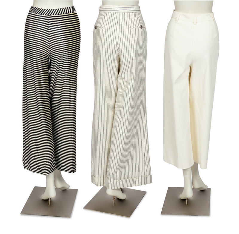 Black and white 100% cotton striped pant, zipper closure at the front, two functioning slant pockets, and a wide cuffed leg. Pants retainl the retail label listing the price at $1,700.00.