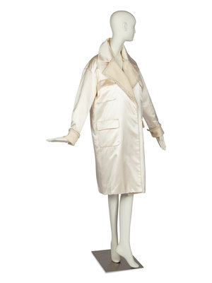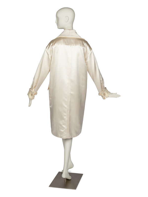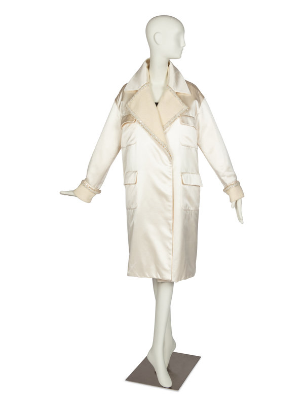 Ivory silk satin and wool coat trimmed with clear and gold beads. The coat is cut with a wide notched lapel, long cuffed sleeves, four flapped pockets on the front, and a center front that hangs open with no closures. The coat retains the retail labels listing the price at $13,850.00.
