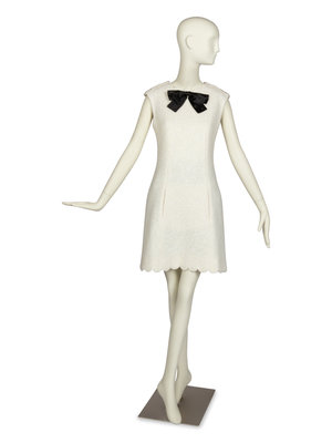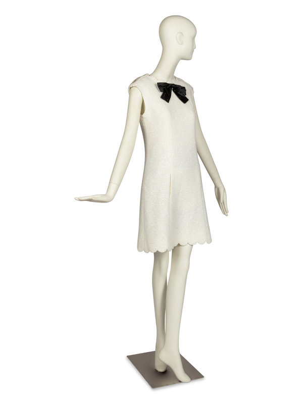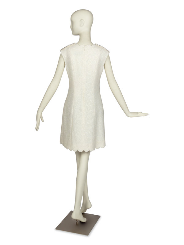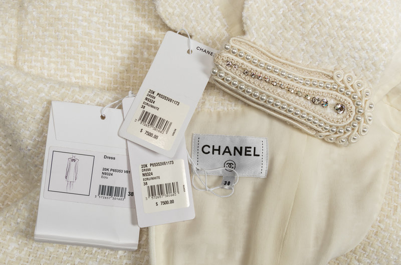 Sleeveless polyester-blend white boucle dress with embroidered pearl epaulettes, scalloped neckline, black silk satin bow pin at the neckline, pockets in-seam over each hip, and a center back zip. The dress is embellished with a small CC logo on the left hip. The dress is lined with white silk and retains the retail label listing the price at $7500.00.