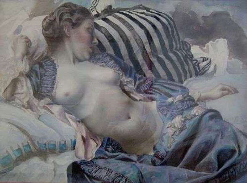 FEMALE NUDE SLEEPING ON A STRIPED CUSHION