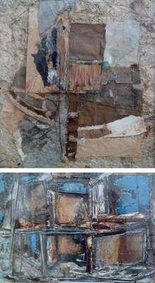 mixed media collage, 7 1/4 x 10 1/4 in.; and another similar by the same hand, 8 x 7 1/4 in.(2)