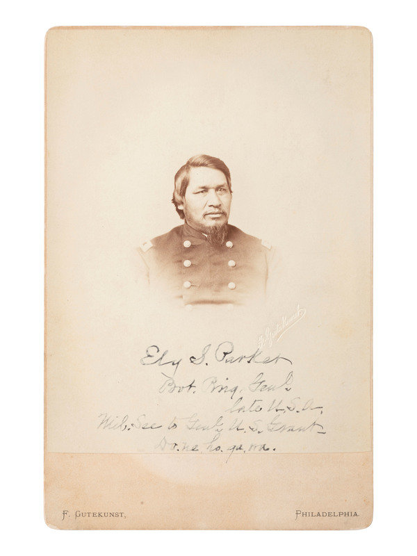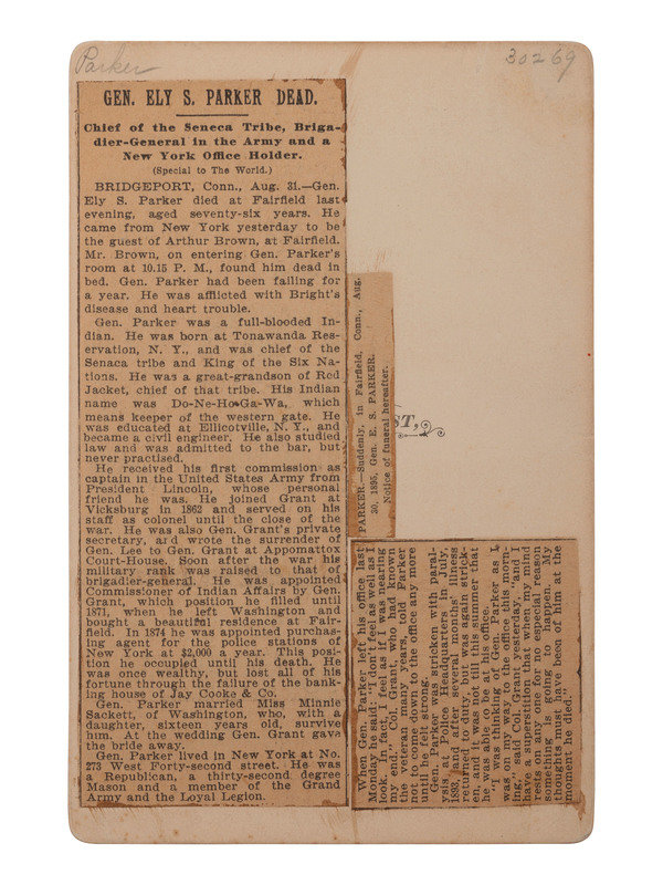 4 1/8 x 5 7/16 in. cabinet photograph on cardstock mount (toning, light spotting/smudging to image; some discoloration and spotting to mount). Photographer's blindstamp to photograph and imprint to mount recto and verso, though verso is mostly obscured by affixed newspaper clipping reporting Parker's death. Image signed "Ely S. Parker, Bvt. Brig. Genl., late U.S.A., Mil. Sec to Genl. U.S. Grant., Do.ne.ho.ga.wa." Parker appears in military uniform in this vignetted bust portrait.