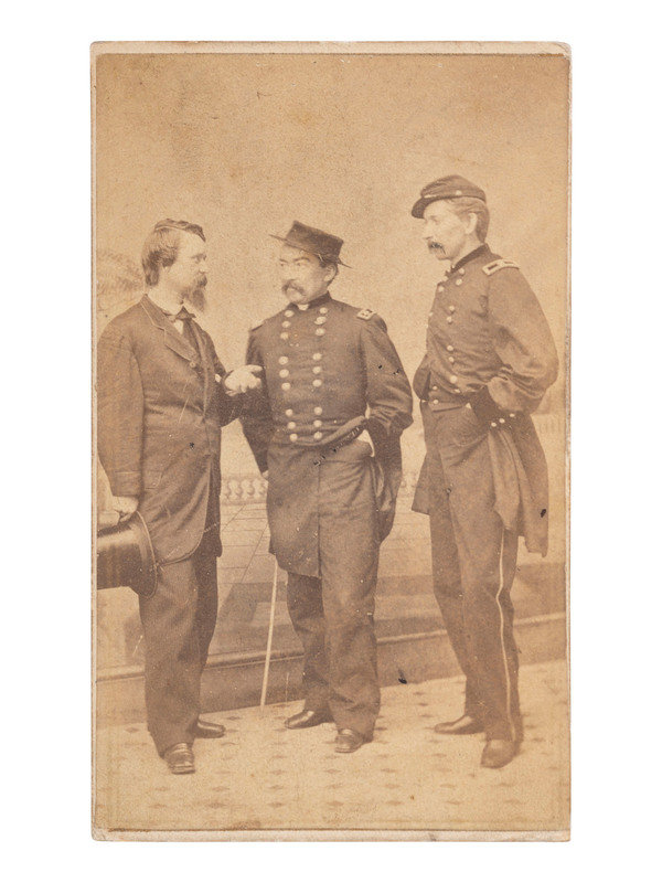 [CIVIL WAR]. CDV featuring General Philip H. Sheridan, General James W. Forsyth, and an unknown civilian. New Orleans: T. Lilienthal, n.d.