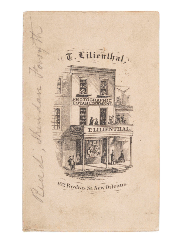 2 5/16 x 3 13/16 in. CDV on cardstock mount (print with toning, soiling, a few spots, and a few punctures near upper edge; mount with edges clipped). Lilienthal's pictorial imprint to verso along with penciled identification of subjects: "Read, Sheridan Forsyth."