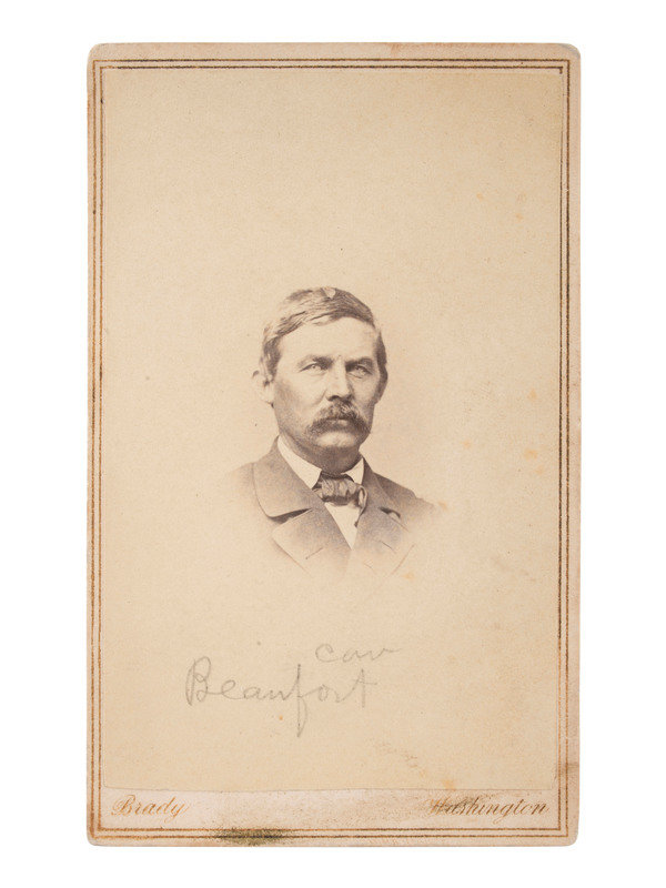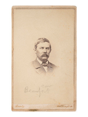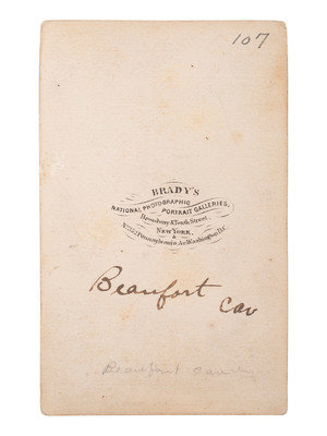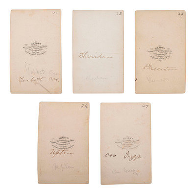 The following CDVs include Brady's Washington, DC, imprint to mount recto and/or verso: John Buford, best known for the major role he played during the first day of the Battle of Gettysburg on 1 July 1863 while in command of his cavalry division (few stains to mount). -- Alfred Thomas Torbert. -- Hugh Judson Kilpatrick (occasional spotting/soiling to print and mount). -- David McMurtrie Gregg (2), (one with small chip to top right corner of print). -- August Kautz. -- Samuel Sturgis. -- Alfred Pleasonton (occasional spotting, light surface abrasions near top left corner). -- Emory Upton.