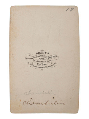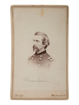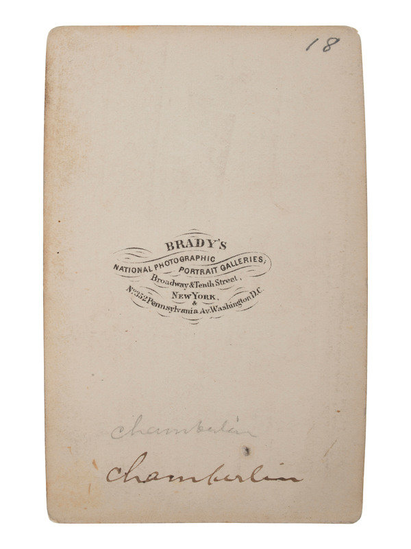 2 3/16 x 3 3/8 in. CDV on cardstock mount (some discoloration and soiling to print and mount; mount with edge/corner wear and a slight curve likely from non-flat storage). Brady's imprint to mount recto and verso. Period ink identification "Chamberlain" to verso, with additional pencil identifications to verso and image. Vignetted bust profile portrait of Chamberlain wearing brigadier generals' shoulder straps and frock coat.