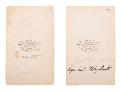 Shoulder-length portrait of Wesley Merritt, period identification to verso (small chip to lower left corner of print, few spots; some soiling, edge and corner wear to mount). -- Seated view of Merritt with a mustachioed officer standing at his side, inked identification to verso and faint penciled notation (light edge and corner wear to mount). -- Together, 2 CDVs, 2 1/8 x 3 5/8 in., on cardstock mounts. Each with Brady's Washington, DC, imprint on mount recto and verso.