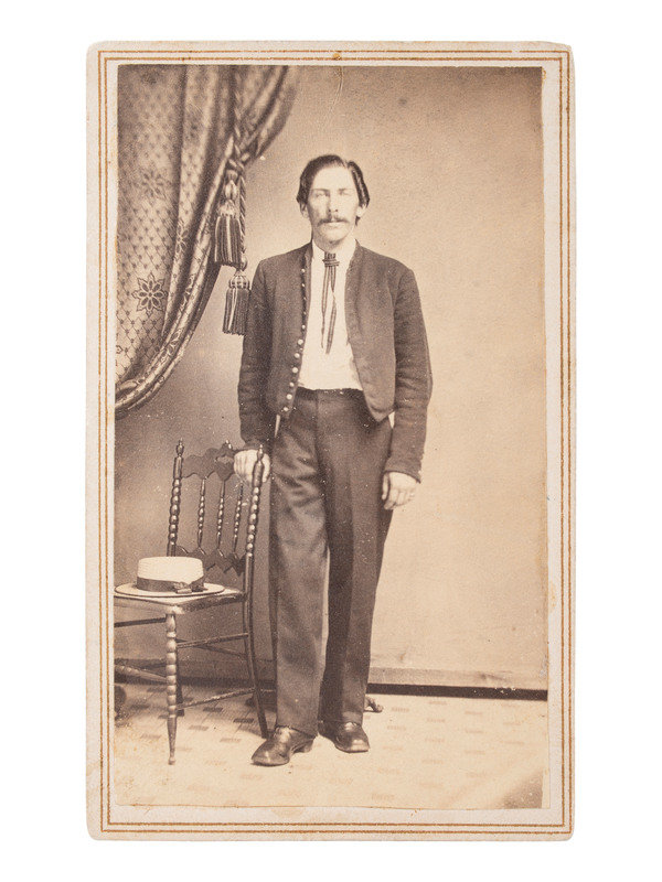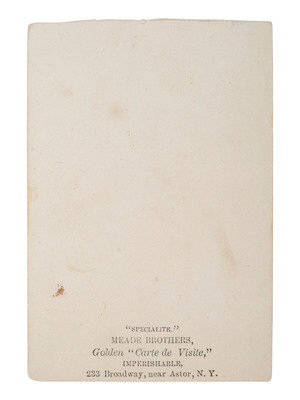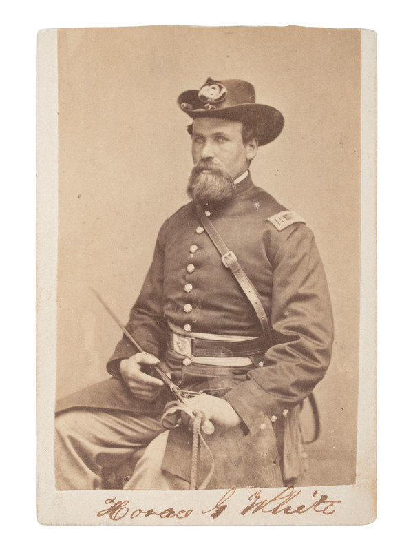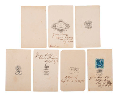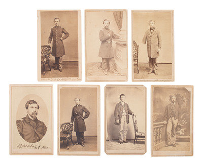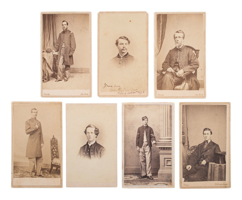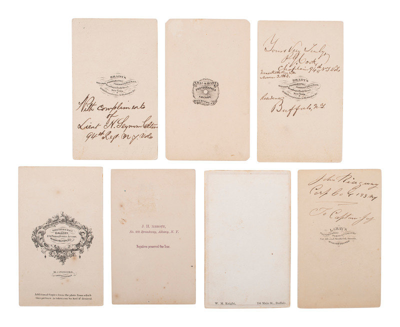 10 CDVs of identified soldiers from the 94th New York Infantry, many autographed. Subjects include: Captain Horace G. White, POW 7/1/1863 Gettysburg, PA, confined at Macon, GA, and Columbia, SC, WIA 7/1/1863 Gettysburg, PA. Astor, NY: Meade Brothers (top edge of print and mount trimmed). -- Nathan Hildreth, possibly autographed as a corporal, WIA 2/7/1865, severe wound in left leg, amputated, DOW 3/4/1865. LaFargeville, NY: C.P. Rood (clipped corners). -- Charles E. Hulbert, autographed as 1st lieutenant. Watertown, NY: Charles S. Hart (clipped corners). -- Philos G. Cook, autographed as a chaplain "near Kettle Run, Va, Novem. 3, 1863." New York: Brady, 1863. -- Byron Parsons, autographed as a captain, 9 June 1863, WIA 7/1/1863 Gettysburg, PA, POW 8/19/1864 Weldon Railroad, VA, paroled 3/1/1865. Washington, DC: Whitehurst Gallery, 1863. -- Charles Scoville, autographed as adjutant. Watertown, NY: Charles S. Hart. -- Samuel A. Moffett, autographed, POW 8/19/1864 Weldon Railroad, VA, confined at Danville, VA, paroled 3/15/1865. Uncredited (small chip to left edge). -- Charles V. Mesler, possibly autographed, POW 8/19/1864 Weldon Railroad, VA, paroled 3/15/1865. Baltimore, MD: Bendann Bros. -- Willard L. Cook, WIA 8/30/1862 2nd Bull Run, VA, severe wound in right arm, amputated. Waterton, NY: Charles S. Hart (light wear to top edge of mount). From 1870-1879, Cook served as a lighthouse keeper at Rock Island Lighthouse in New York. -- N. Seymour Colton, autographed as lieutenant. New York: Mathew Brady.