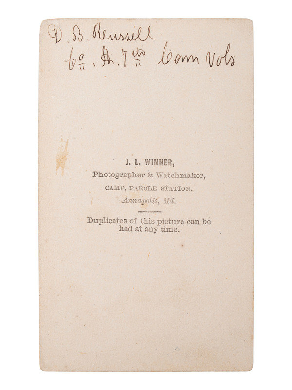 [With:] 3 CDVs of identified soldiers from Connecticut and New York, including: Diodate Russell, 7th Connecticut Infantry, POW 7/11/1863 Fort Wagner, SC, paroled 7/24/1863. Camp, Parole Station, Annapolis, MD: J.L. Winner. Backmark indicates that this was taken when Russell was paroled. -- Charles W. Jackson, 106th New York Infantry, autographed, POW 4/29/1863 Fairmount, VA, paroled same day. N.p.: Tupper (loss to top right corner of print). 2 cent revenue stamp to verso. -- John H. Ridgway, 133rd New York Infantry, autographed as corporal. Williamsburg [VA?]: L. Gray (small chip to lower left corner of print).