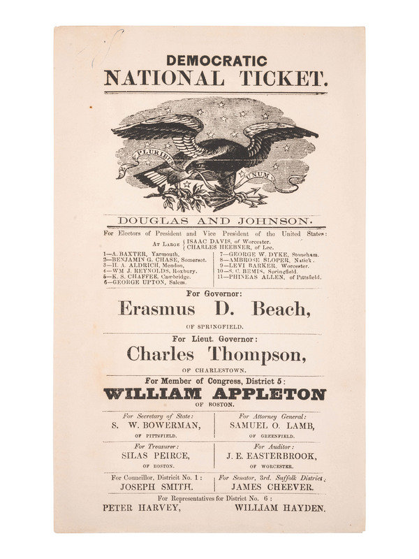 "Douglas and Johnson" ticket of the northern wing of the Democratic Party for the 1860 Massachusetts elections for presidential electors, Representative to Congress from the 5th District, governor, and other state and local offices, 1p, 5 3/4 x 9 1/2 in. (light toning, mark near upper left corner). Ticket features a patriotic emblem of American eagle against a starry sky, with olive branch and arrows in talons, and riband "E. Pluribus Unum."