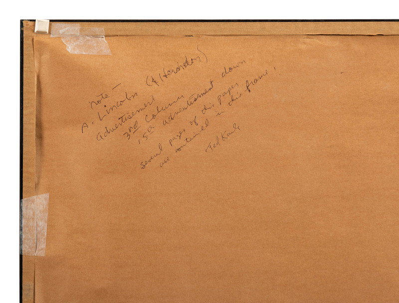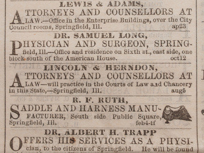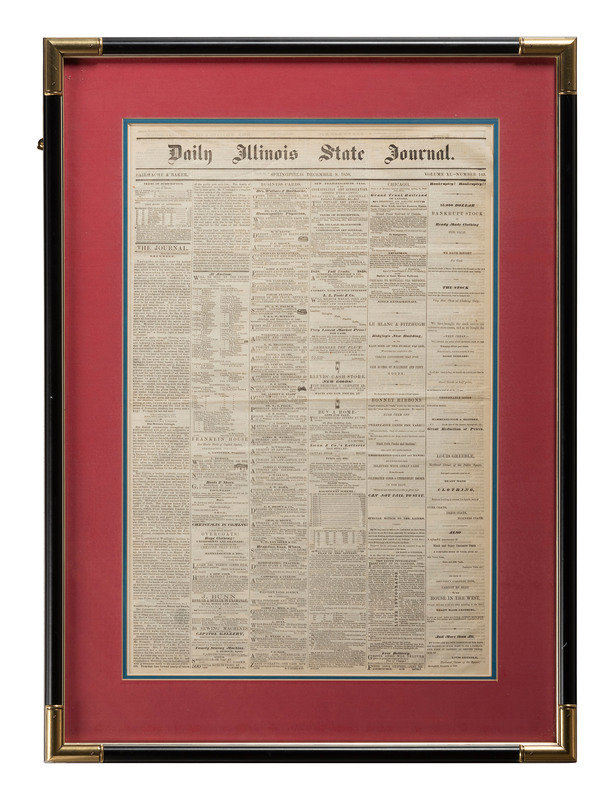 Daily Illinois State Journal. Springfield, IL: 9 December 1858. Folio, 4pp., 15 1/2 x 23 1/2 in. (visible), professionally matted and framed, 22 3/4 x 31 in. overall (folds and light creasing, light edge wear). Featuring front-page advertisement for Lincoln & Herndon law firm: "Lincoln & Herndon, Attorneys and Counsellors at Law, will practice in the Courts of Law and Chancery in this state, Springfield, Ill."