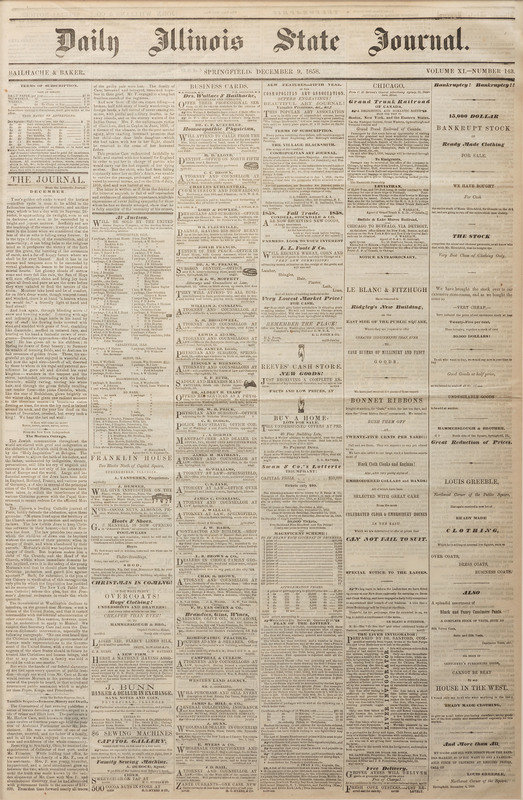 [LINCOLNIANA]. Daily Illinois State Journal. 9 December 1858. With Lincoln & Herndon advertisement.