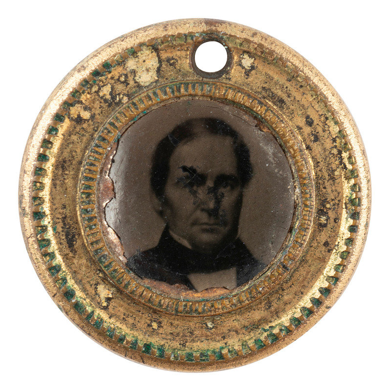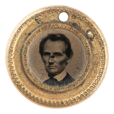 15 mm diam. gilt brass frame featuring 10 mm diam. ferrotypes of Abraham Lincoln and Hannibal Hamlin on the obverse and reverse, respectively (spotting on both ferrotypes including spot/blemish on Lincoln's nose, some edge loss to Hamlin ferrotype, some tarnish to frame).
