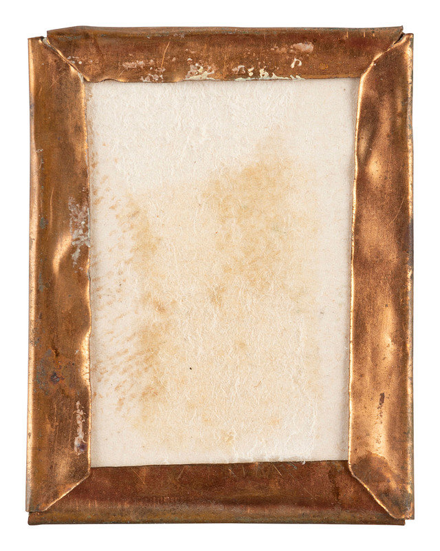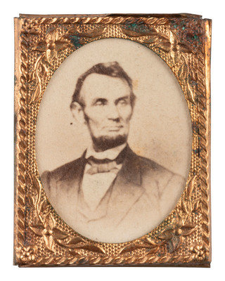 3/4 x 1 in. albumen portrait after lithograph/engraving of Abraham Lincoln housed under brass mat (light toning to print, few light spots; tarnish to mat).