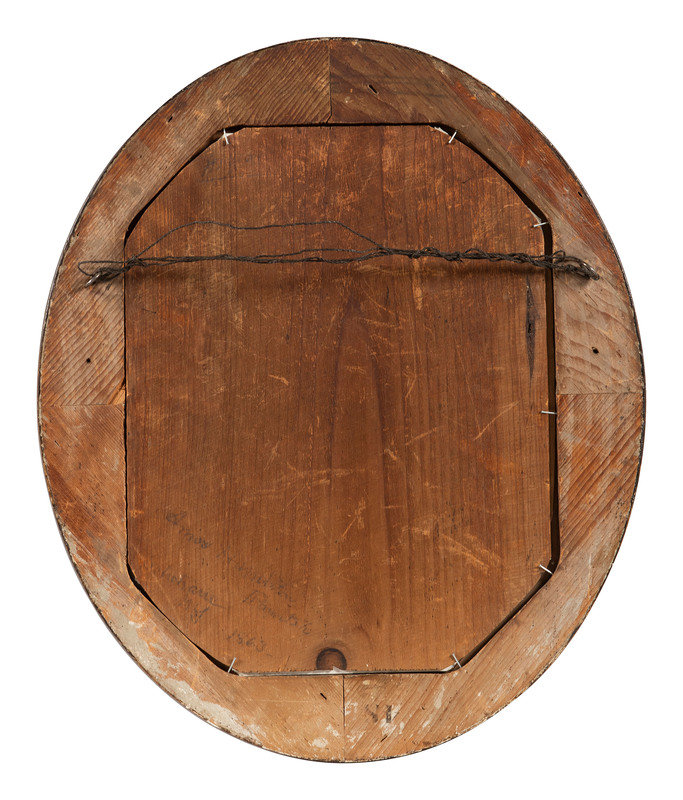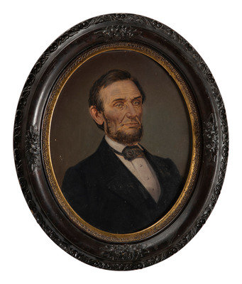 10 1/2 x 13 1/4 in. (sight) oil painting of Abraham Lincoln housed under glass in 15 1/2 x 18 1/2 in. decorative frame (typical light crazing to the black paint, otherwise very good, unexamined outside the frame). The frame backing is inscribed in pencil, "Amos Hamilton, Painter, Schoharie, NY 1863."
