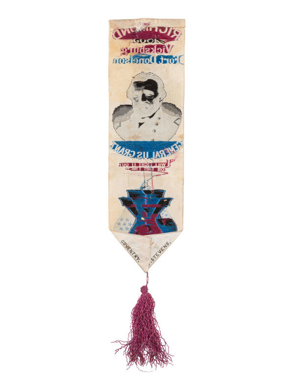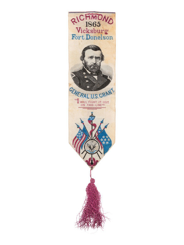 5 1/4 in. (length without tassel) white woven silk stevengraph ribbon with purple tassel (soiling/staining, light splitting to threads within top text). Verso with maker's information, "T. Stevens / Coventry." Ribbon's center features a bust portrait of Grant between text reading "Richmond / 1865 / Vicksburg / Fort Donelson / General. U. S. Grant. / 'I will fight it out on this line.'" Four flags crossed with circular eagle motif make up the bottom portion of the ribbon.