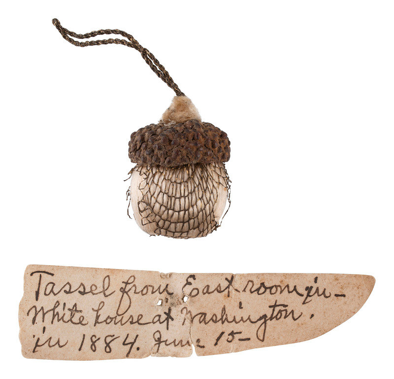 Tassel in the form of an acorn, 2 in. long (some loss to netting, surface soiling). Accompanied by manuscript label identifying the artifact as a, "Tassel from East room in - White House at Washington in 1884, June 15-." A curious souvenir from the White House while inhabited by President Chester A. Arthur.