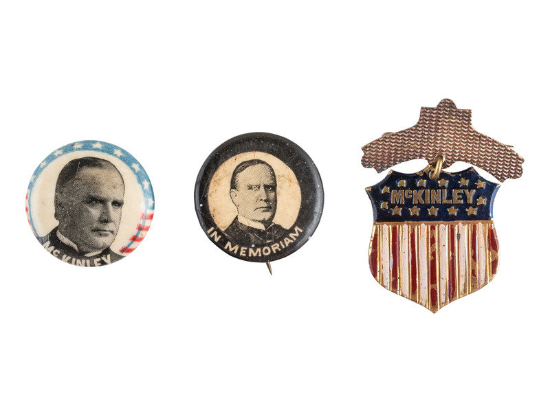 [With:] 2-part pinback with "McKinley" patriotic shield suspended at bottom, 1 1/2 in. ln. -- Cello pinback featuring portrait of McKinley above patriotic background, 7/8 in. dia. (some soiling). -- Cello pinback featuring portrait of McKinley, above black background, with "In Memoriam" below, 7/8 in. dia. (some soiling).