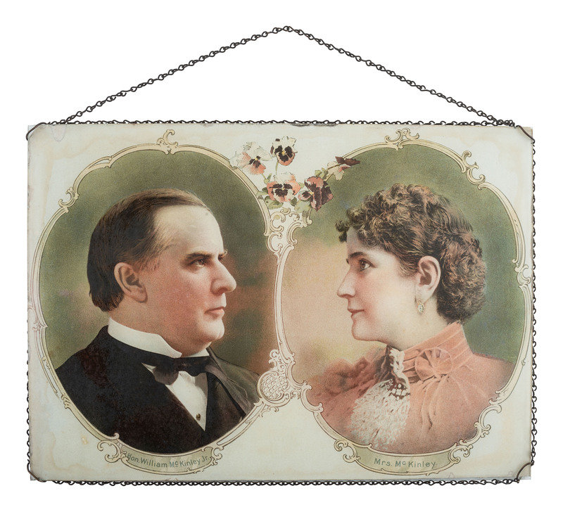 14 x 10 in. lithographed portraits of "Hon. William McKinley Jr." and "Mrs. McKinley" displayed as a wall plaque and housed under a protective layer of glass, with original chain for hanging (some staining to margins, few small chips to edges of glass.