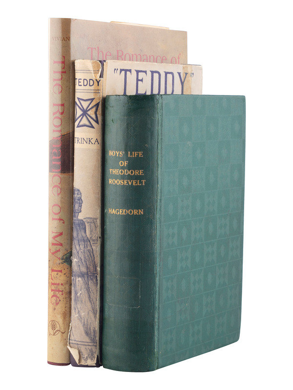 [With:] HAGEDORN, Hermann. The Boys’ Life of Theodore Roosevelt. New York and London: Harper & Brothers, 1918. 8vo. Illustrations. (Repairs to some page edges, toning.) Co Provenance: Ellendale Public Library (library markings and withdrawn stamp). -- TRINKA, Z’Dena. “Teddy” The Saga of the Badlands. Lidgerwood, ND: International Book Publishers, 1958. 8vo. Illustrated. Original purple cloth; original illustrated dust jacket (toned, aged tape, some chips). Centennial Edition. -- VIVIAN, James F. The Romance of My Life: Theodore Roosevelt’s Speeches in Dakota. [Fargo, ND]: Prairie House, 1989. 8vo. Photographic plates. Original maroon boards; original illustrated dust jacket. (Very fine.) -- Together, 3 works in 3 volumes related to Theodore Roosevelt, all FIRST EDITIONS except where noted, 8vo.