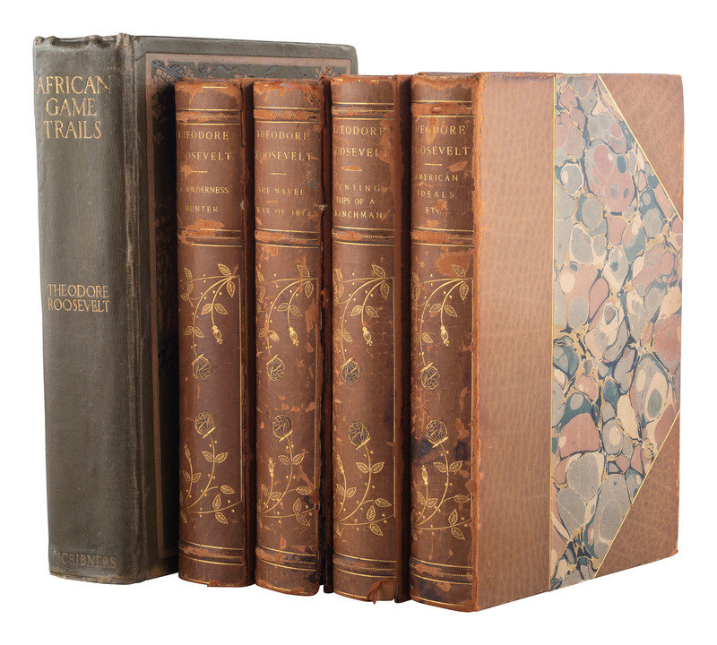 ROOSEVELT, Theodore. Hunting Trips of a Ranchman: Sketches of Sport on the Northern Cattle Plains. -- ROOSEVELT, Theodore. The Wilderness Hunter. (Front board detached). -- ROOSEVELT, Theodore. American Ideals and Other Essays, Social and Political. -- ROOSEVELT, Theodore. The Naval War of 1812. (Front board detached). -- Together, 4 works in 4 volumes, all published New York and London: G.P. Putnam’s Sons, [ca 1905], all Presidential Editions, 8vo, all uniformly bound in three-quarter olive calf gilt with marbled boards, condition generally fine except where noted.