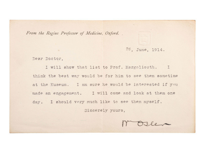 Typed letter signed ("Wm Osler") to unidentified "Doctor," on Osler's personal stationery "From the Regius Professor of Medicine, Oxford." 1p, 7 x 4 1/4 in. (creasing, toning).