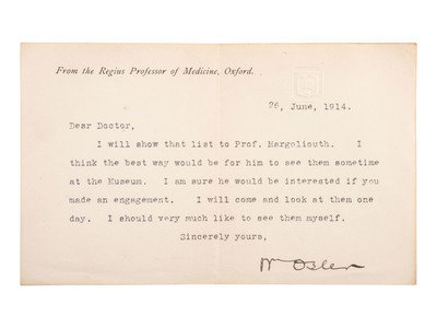 Osler writes, in full: "I will show that list to Prof. Margoliouth. I think the best way would be for him to see them sometime at the Museum. I am sure he would be interested if you made an engagement. I will come and look at them one day. I should very much like to see them myself."