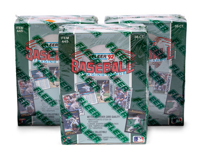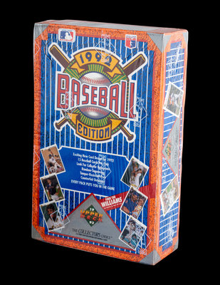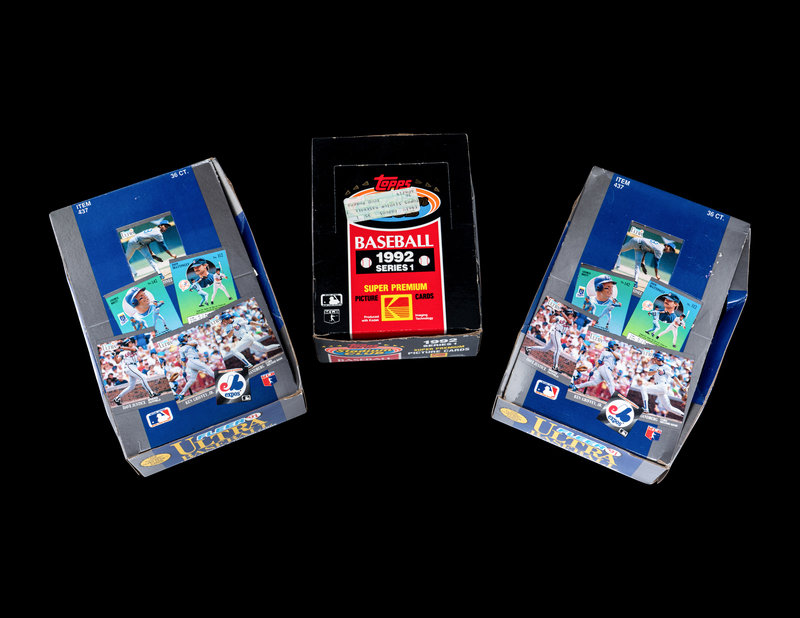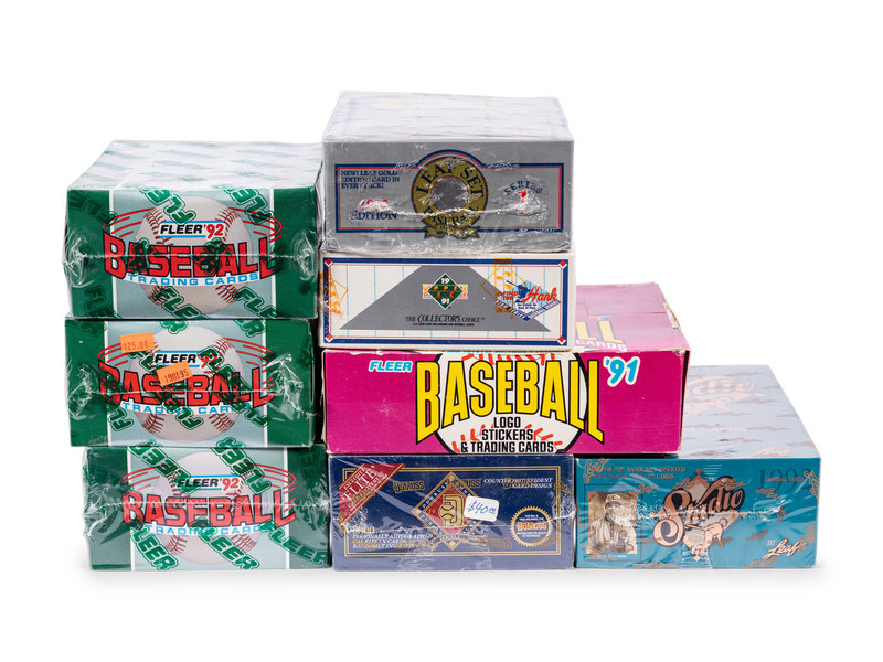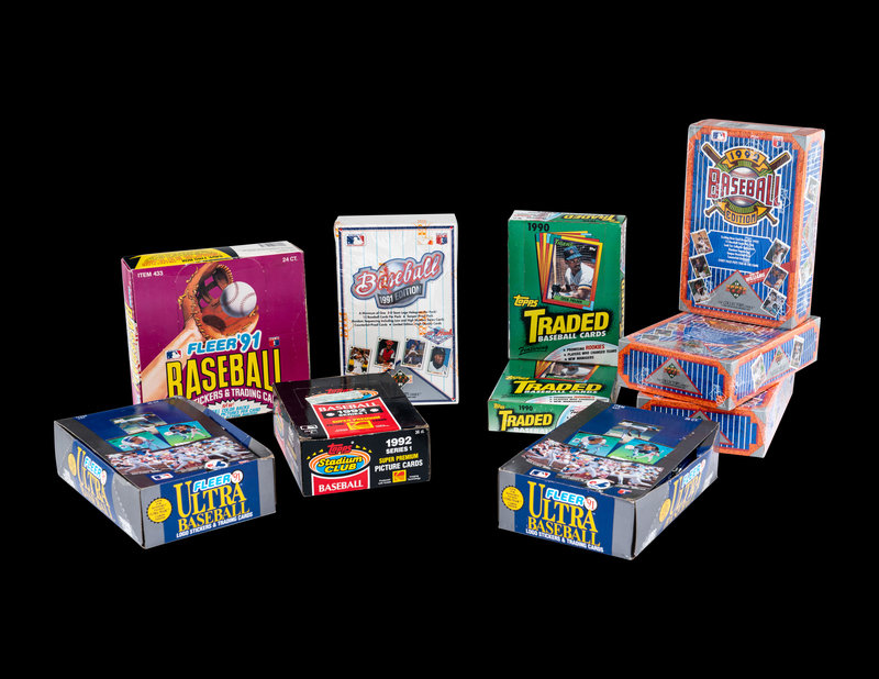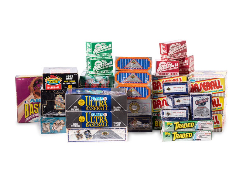 comprising five 1989 Fleer boxes; three 1989 Topps Traded boxes; one 1990 Score box; two 1990 Topps Traded boxes; one 1991 Fleer Jumbo box; two 1991 Fleer Ultra boxes; three 1991 Topps Traded boxes; one 1991 Upper Deck Series One box; five 1991 Upper Deck Final Edition boxes; one 1992 Donruss Series One box; three 1992 Fleer boxes; one 1992 Leaf Series One box; one 1992 Leaf Studio box; three 1992 Upper Deck Series One boxes; one 1992 Topps Stadium Club box; one 1993 Upper Deck Series One box.