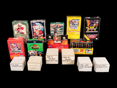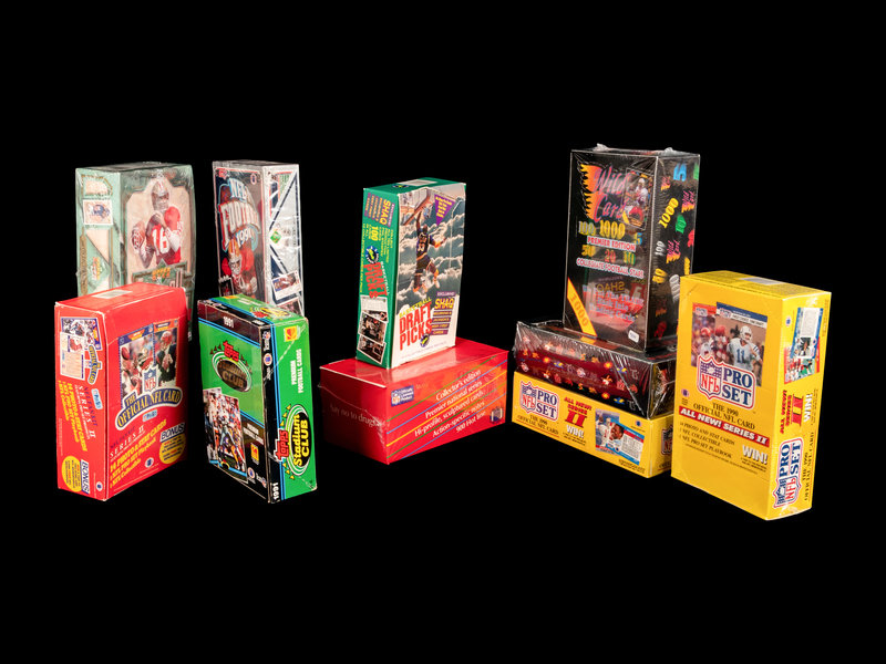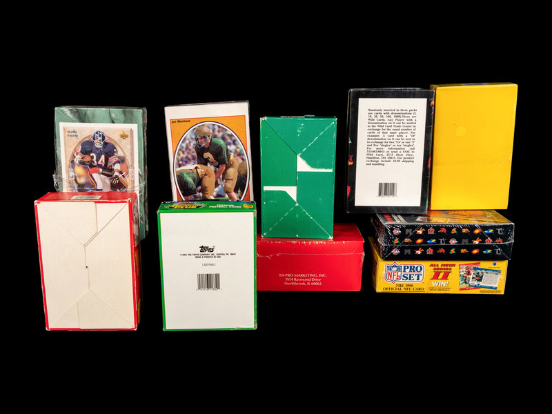Football: One 1989 NFL Pro Set Series Two box (36 unopened packs); one 1990 Action Packed football Series One box; two NFL Pro Set Series Two boxes (36 unopened packs); one 1991 Topps Stadium Club football box (36 unopened packs); one 1991 Upper Deck football box (36 unopened packs, possible Joe Montana autographed card); one 1991 Wild Card Collegiate box (36 unopened packs); one 1991 Wild Card Collegiate complete set (Brett Favre rookie) one 1992 Upper Deck football box (36 unopened packs, possible Walter Payton autographed card); one 1992 Wild Card World League box (36 unopened packs).