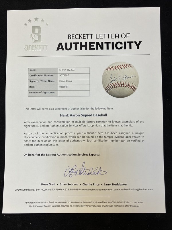 A Hank Aaron Single Signed Autograph Baseball (Beckett Authentication Services Letter),