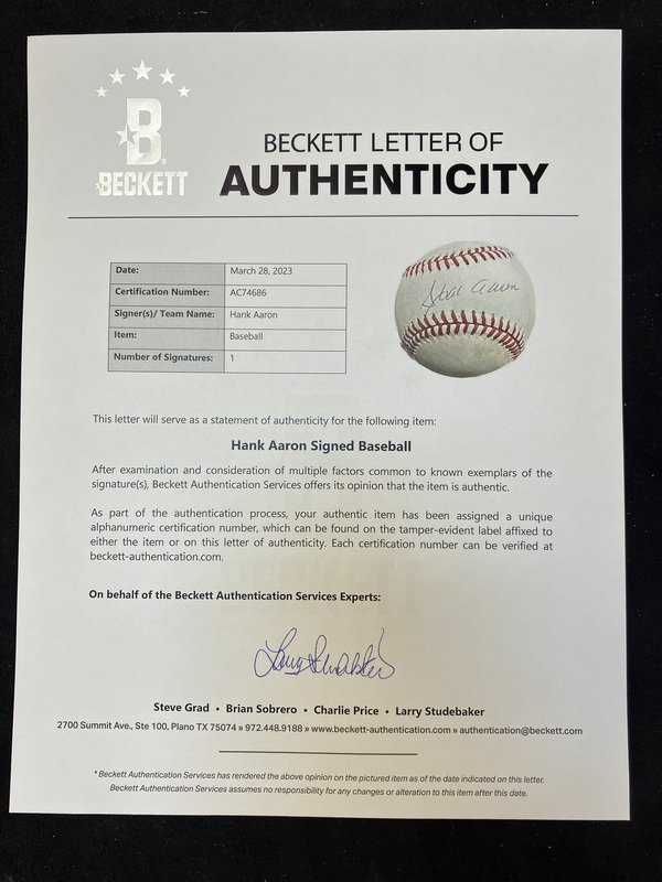 A Hank Aaron Single Signed Autograph Baseball (Beckett Authentication Services Letter),