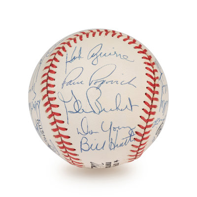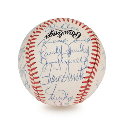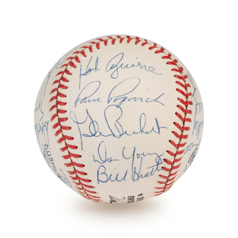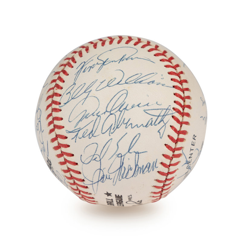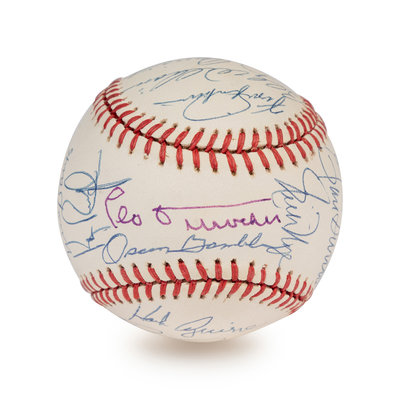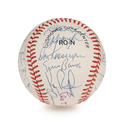comprising 24 signatures including Billy Williams, Fergie Jenkins, Ernie Banks, Leo Durocher, Ron Santo, Nate Oliver, Randy Hundley, Paul Popovich, Glenn Beckert, Don Young, Don Kessinger, Ken Rudolph and Oscar Gamble.
