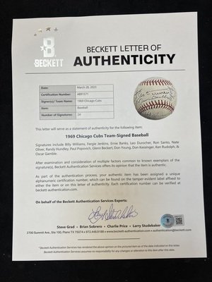 A 1969 Chicago Cubs Team Signed Autograph Baseball (Beckett Authentication Services Letter),