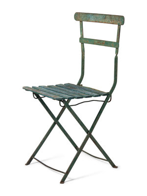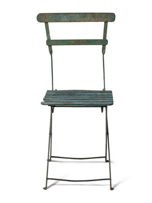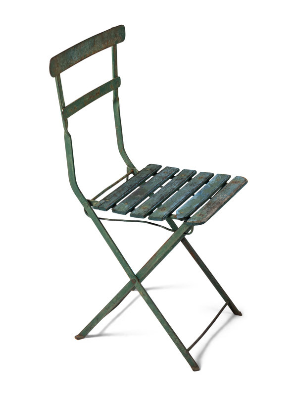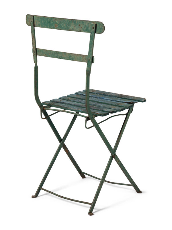 standalone green metal and wood chair from the early days of the Friendly Confines.