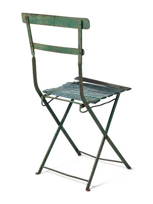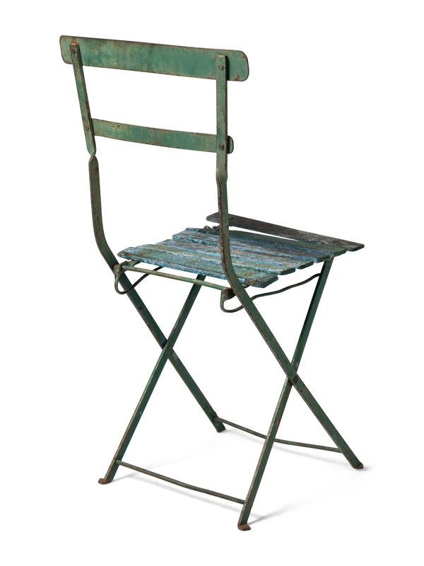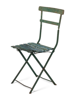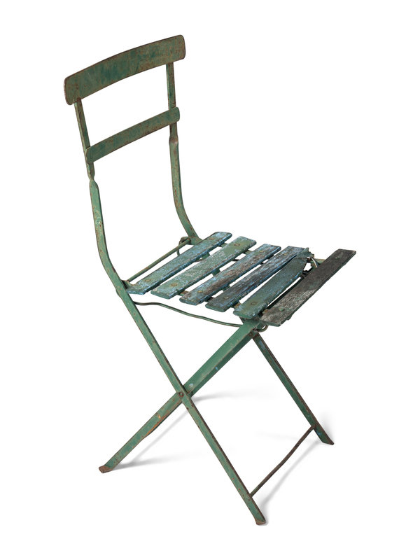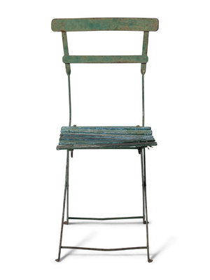 standalone green metal and wood chair from the early days of the Friendly Confines.