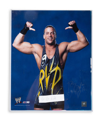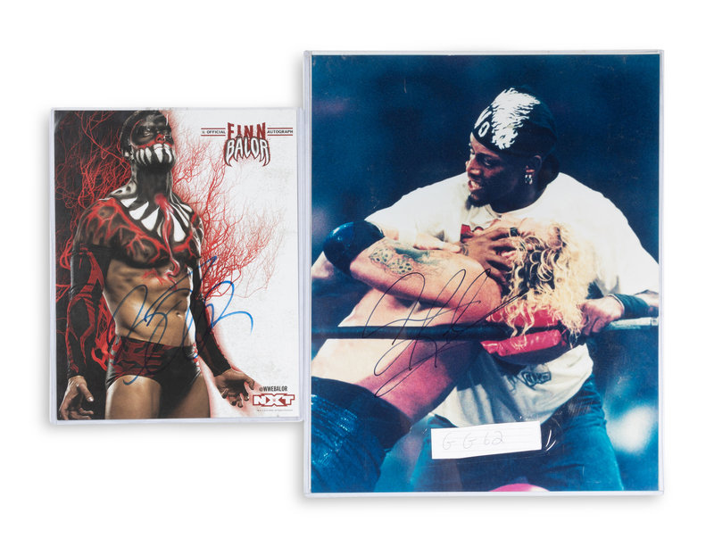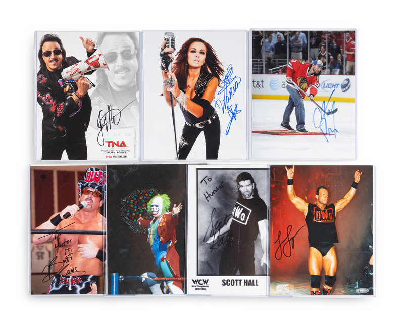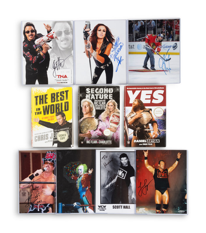comprising signed 16x20 photos of Dennis Rodman and Rob Van Dam; signed 8x10s of Maria, Doink the Clown, Kevin Nash, Lex Luger, Scott Hall, CM Punk, Buff Bagwell, Jim “The Anvil” Neidhart and more; three books including "YES" signed by Daniel Bryan, "The Best in the World "signed by Chris Jericho and "Second Nature" signed by Ric Flair and Charlotte Flair; a 2x4 piece of wood signed by Hacksaw Jim Duggan.