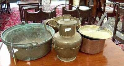 Brass Dutch milk container, ca. 1860; together with a French brass pot lid, a French copper & wrought iron pan, a French brass pan, and an English jam.