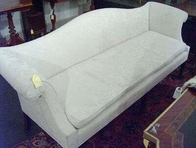 Humpback design with scroll arms over square Chippendale-style legs. H: 36, W: 82 D: 27 in.