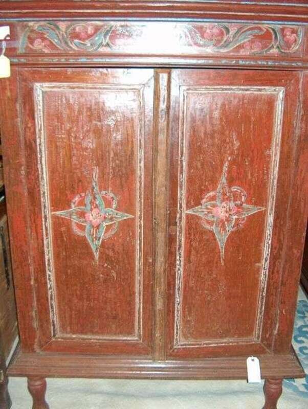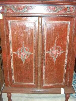 The molded cornice above a foliate-painted frieze above two conforming paneled doors, raised on turned feet. H: 64, W: 46, D: 20 1/2 in.