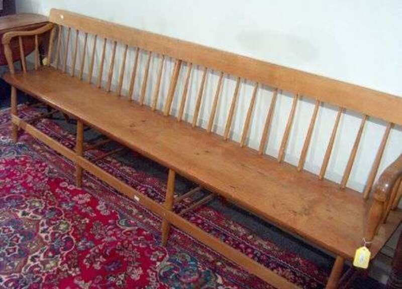 Square crest rail over tapered spindles with shaped arms and turned supports, plank seat ending on turned legs and stretchers. H: 32, W: 96, D: 18 in.
