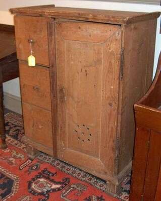 Three drawers and fielded cabinet door raised on stile feet. H: 44 1/2, W: 33, D: 17 1/2 in.