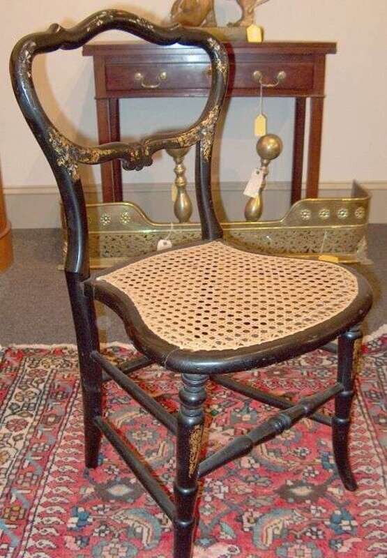 Black ebonized finish with gilt and shell-inlaid decorated frame, caned shaped seat over turned legs and stretchers. H: 31, W: 16 1/2, D: 17 in.